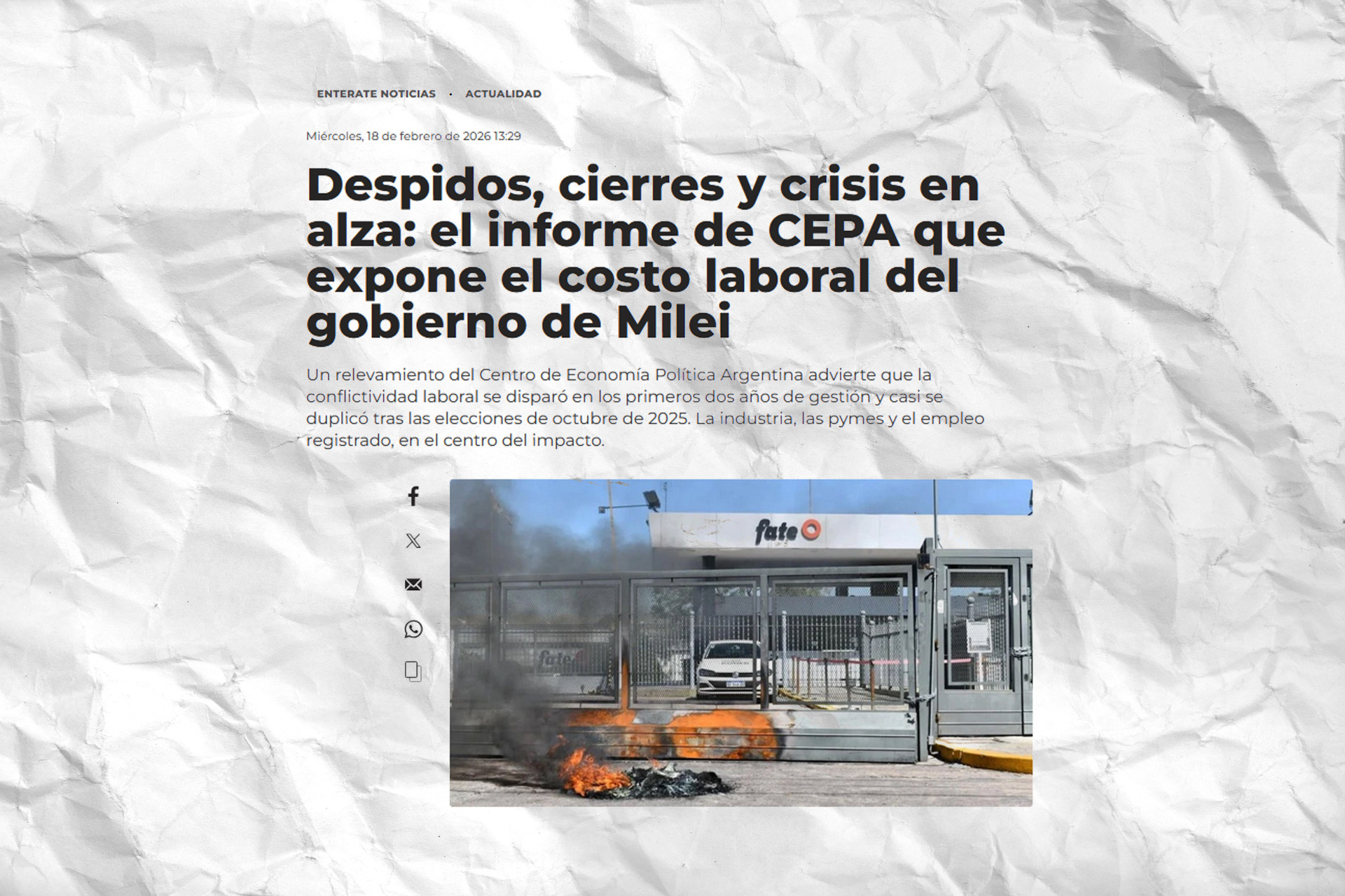 Fate es a los ojos del pueblo argentino el ejemplo más trágico del plan de Milei. Es una típica empresa argentina que se dedica principalmente al mercado interno, puede exportar a algunos países pero su capacidad tecnológica y su nivel de productividad hacen imposible que pueda competir en el mercado mundial. No hay chance alguna de que este tipo de empresas puedan competir frente a la apertura descontrolada de los mercados —a pesar de que Federico Sturzenegger sostenga que "la apertura genera más importaciones y más exportaciones"—.